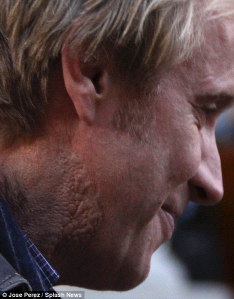 Rhys Ifans, Curt Connors, con unas marcas en el cuello que nos hacen recordan a la piel de un lagarto. ¿La transformación de Lizard será progresiva? Mira las fotos y dínoslo tú: